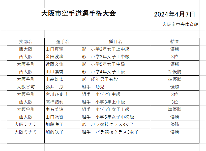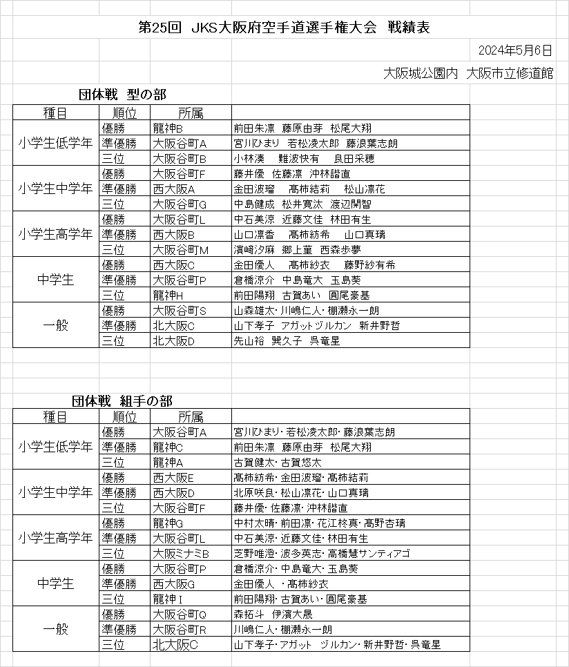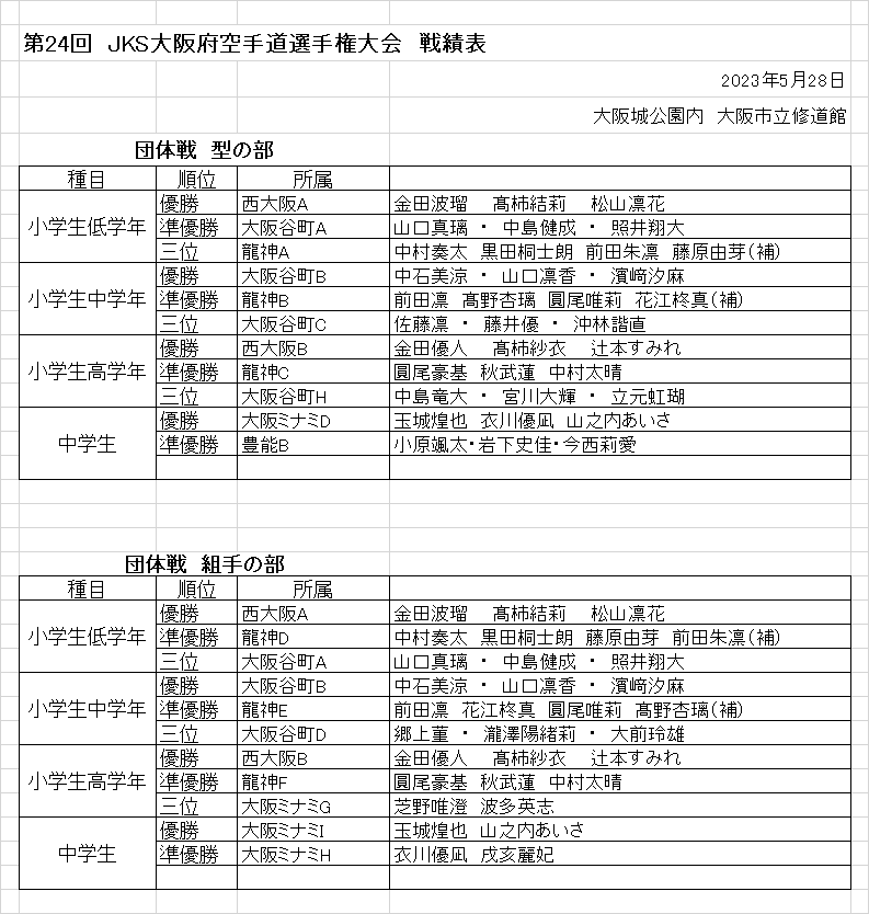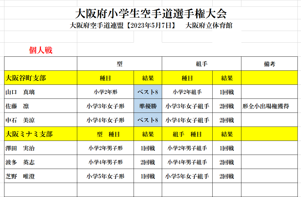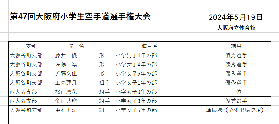 | 第47回 大阪府小学生空手道選手権大会 大阪府立体育館 2024年5月19日 ![]() ![]() ![]() ![]() ![]() ![]() ![]() ![]() ![]() 稽古の成果が出せましたか 基本・基本・基本 基本の積み重ねが大事です |