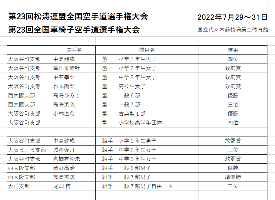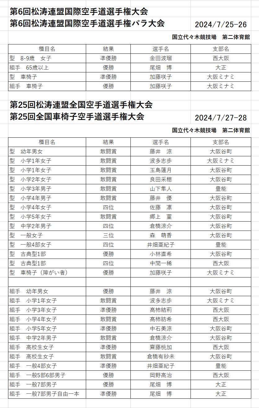 第26回松涛連盟全国空手道選手権大会 第26回全国車椅子空手道選手権大会 2025年8月1日~3日 国立代々木競技場 第二体育館 ![]() ![]() ![]() ![]() ![]() ![]() ![]() ![]() ![]() ![]() ![]() ![]() ![]() ![]() ![]() ![]() ![]() ![]() ![]() ![]() ![]() ![]() ![]() ![]() ![]() ![]() みんな良く頑張りました 全国大会で色々得た事が有ると思います 基本を大事に積み重ねよう |