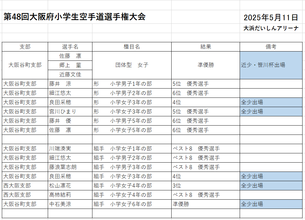 | 第48回大阪府小学生空手道選手権大会 2025-5-11 大浜だいしんアリーナ ![]() ![]() ![]() ![]() ![]() ![]() ![]() ![]() ![]() ![]() ![]() ![]() ![]() ![]() ![]() ![]() ![]() みんな良く頑張りました。 全小出場権獲得した選手は、更に基本頑張ろう もう一歩で届く選手は、もっと、もっと基本頑張ろう |