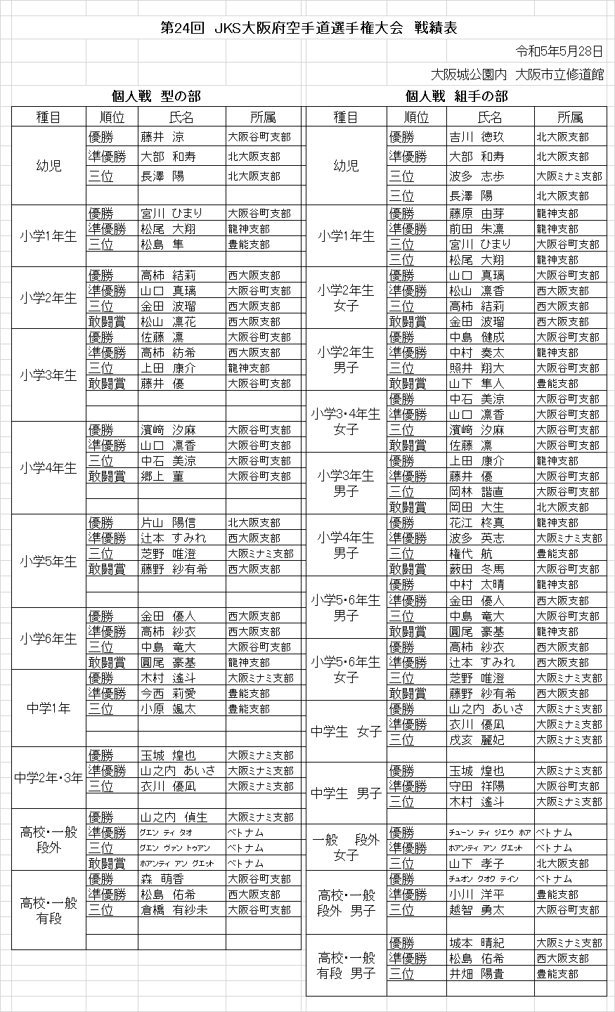 | 第58回大阪府空手道選手権大会 中学生・少年・成年・マスターズ・パラ競技 2024年9月23日 大阪府立体育館 ![]() ![]() 少年男子個人組手の部 準優勝 玉城煌也 (大阪ミナミ支部) パラ競技個人型 クラス3 優勝 加藤咲子 (大阪ミナミ支部) ![]() ![]() ![]() ![]() パラ競技個人組手 優勝 加藤咲子 (大阪ミナミ支部) ![]() ![]() ![]() 稽古は嘘をつかない 基本稽古の積み重ねの成果です。 |